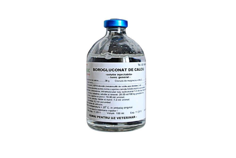Indicatii: Borogluconatul de calciu se foloseste in pareze si paraplegii (ante- si postpartum), hipocalcemii, tetanii, tulburari metabolice, intoxicatii, alergii, toxicoze, rahitism, osteomalacie, stari hemoragice, anemii, ateropatii, dupa accidente postvaccinale